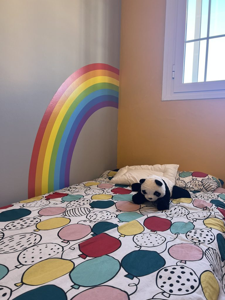 En la pared, un vinilo estilo arcoíris que aporta calidez y alegría al ambiente, combinando tonos suaves que armonizan con cualquier decoración.