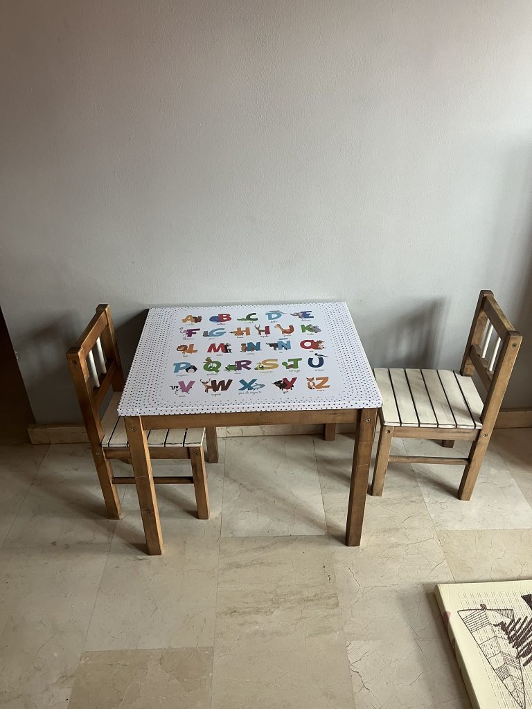En una mesa infantil, un vinilo con el abecedario decorativo, ideal para estimular el aprendizaje mientras los niños juegan.