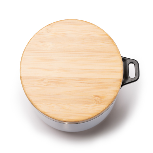 Termo con diseño multifuncional de acero inoxidable 304 con tapa de bambú y base de corcho. Con capacidad para 400ml. Incluye cuchara con agarre en la tapa, facilitando así su transporte y almacenamiento conjunto. Cuenta con refuerzo de silicona en la tapa para evitar derrames accidentales y goteo. Una opción versátil, funcional y práctica pensada para mantener la temperatura tanto de líquidos como de comida.