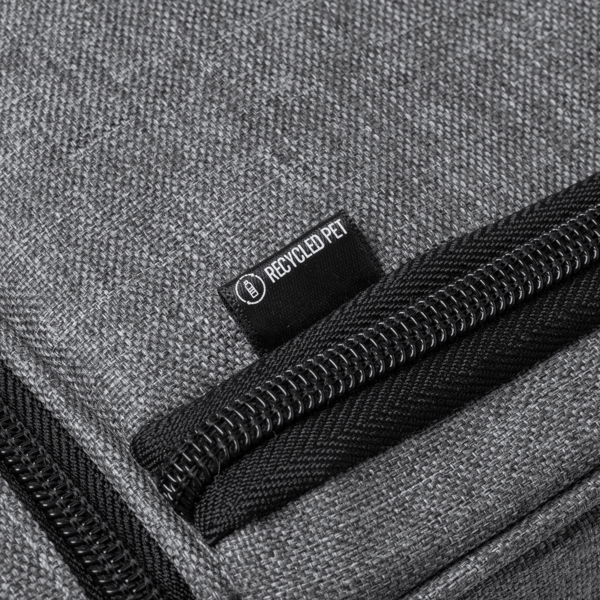 Nevera de políester reciclado RPET con diseño vigoré. Doble compartimento independientes con cierre de cremalleras y con interior isotérmico. Asas de transporte y base en PU Leather.