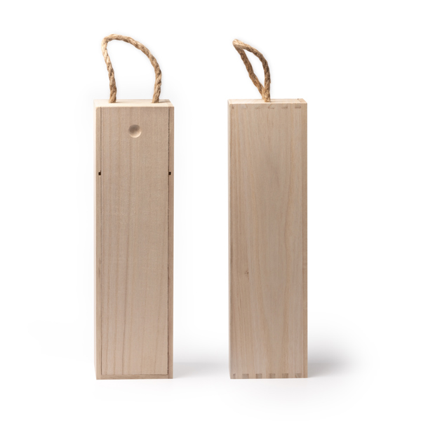 Caja de madera con asa para transportar de manera segura y elegante una botella de vino. Ofrece resistencia y durabilidad para proteger tu botella durante el transporte gracias a su soporte especial para el cuello de la botella. Esta caja de madera protege la botella en su interior de golpes, cambios de temperatura u otros agentes externos.