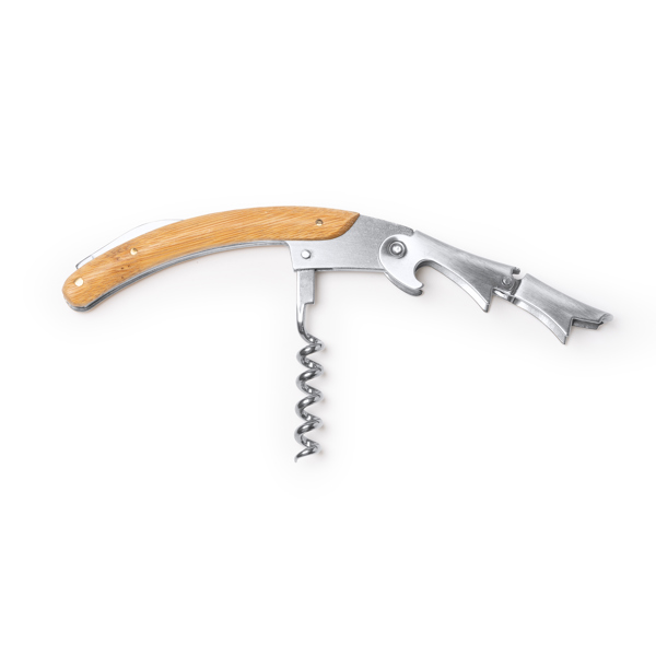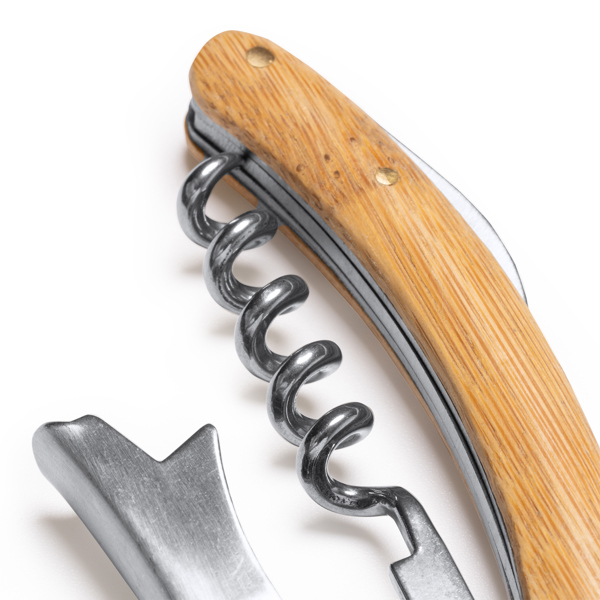 Sacacorchos de acero inoxidable estilo clásico con mango en bambú, elegante y funcional. Ofreciendo durabilidad y resistencia, con un agarre cómodo y seguro. Con mecanismo de doble palanca para facilitar el proceso de apertura, minimizando el esfuerzo requerido.