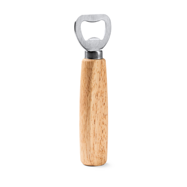 Abridor de acero inoxidable con empuñadura de madera natural.