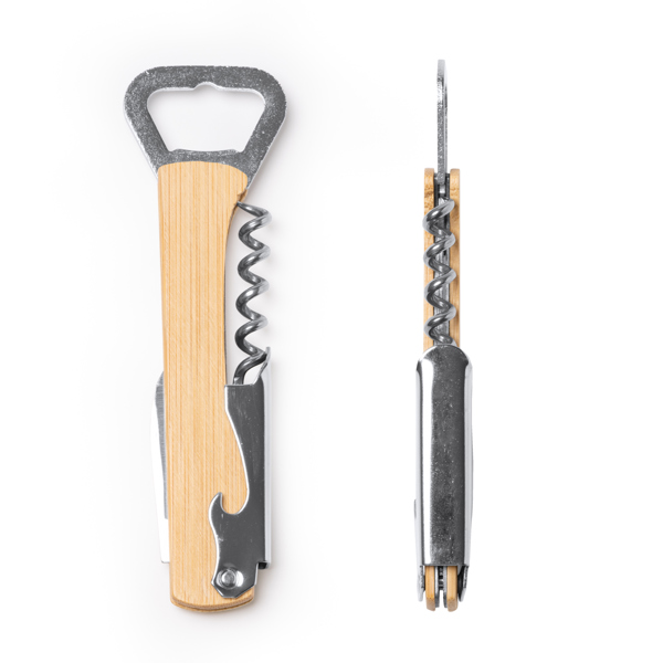 Abridor con sacacorchos de acero inoxidable de estilo clásico con mango de bambú. Incorpora accesorio con función para corte.
